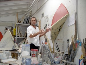 Des de la Frontera —Port Bou no té cap galeria d’art ni espai comparable a Horizon—, per tant, la simbiosi resulta perfecte, tot i que l’artista “italoamericocatalà” —que és com dir que és una mica de tot arreu i d’enlloc— es reserva la seva parcel·la creativa amb perfecte zel. L’estudi, en aquest sentit, és molt a prop de l’habitatge però manté el seu caràcter exempt, a diferència de la galeria: es tracta d’un simple cobert on les pintures i els objectes pictòrics s’amunteguen responent a un ordre més mental que no pas espacial. Aquesta és la seva raó de ser creativa. I és que, des dels seus orígens, la pintura de Ralph Bernabei s’ha vist marcada per un procés dialèctic polaritzat entre la profunditat existencial dels camps de color i l’energia elèctrica del traç nerviós; tota l’aventura plàstica de l’italoamercià es manté extremadament coherent a la seva estructura profunda de diàleg obert però evoluciona en els seus matisos i, especialment, en la intensitat i el protagonisme de les veus que intervenen en la conversa plàstica. En aquest sentit, si fa pocs anys la seva pintura era pràcticament un manifest sobre com reduir la paleta a una escala de grisos essencial, actualment segueix amb la monocromia però introduint la violència d’uns vermells que se situen just a les antípodes de l’asèpsia del blanc i del negre; si fa pocs anys el traç era recursiu i s’arremolinava sobre ell mateix, avui tendeix a l’atectonisme, a fugir del marc quadrangular per dispersar-se en el buit, per seguir dibuixant-se en l’aire que envolta la pintura.