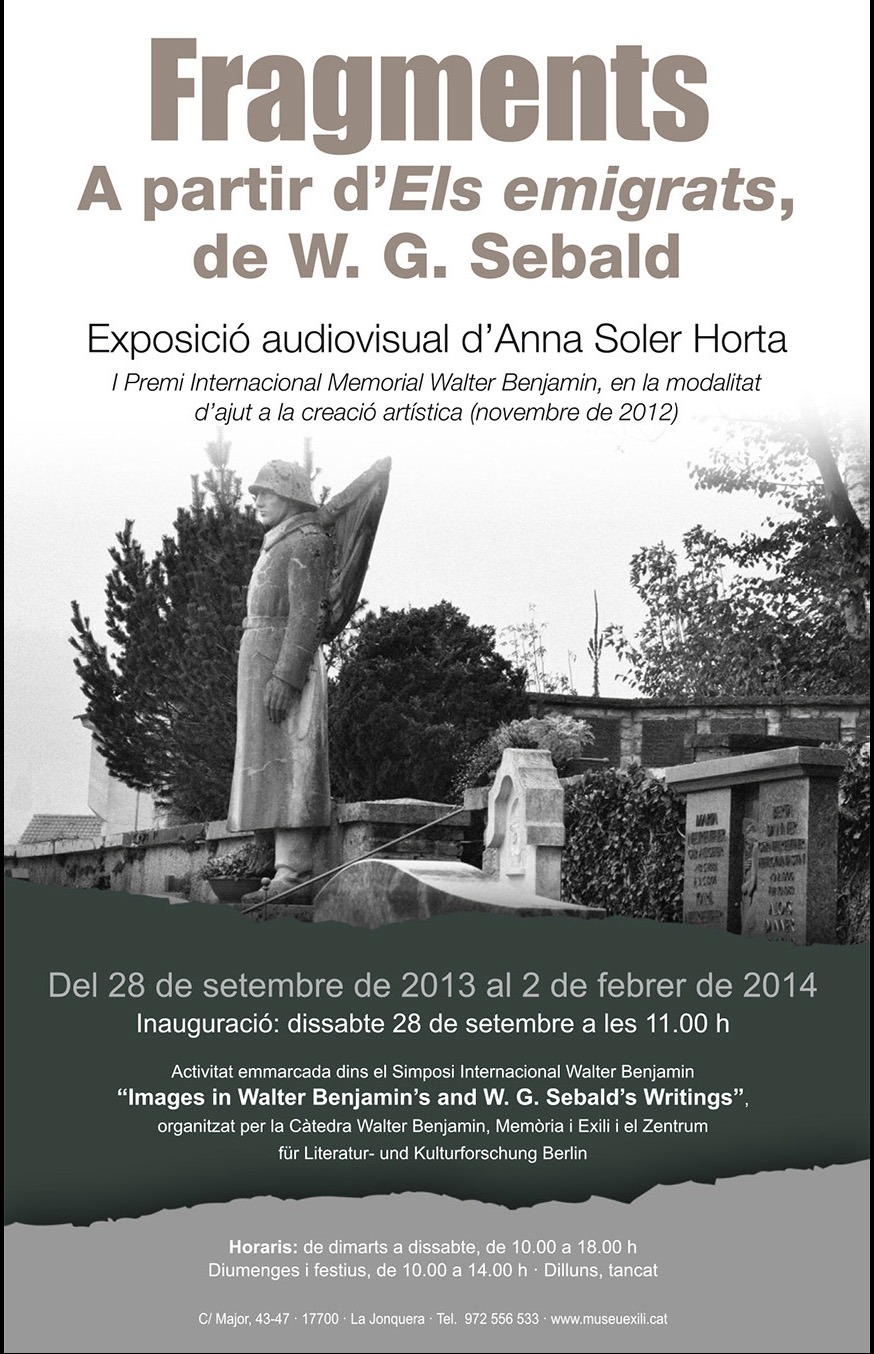 Diem tot això per contextualitzar un parell d’exposicions que també són fruit d’haver guanyat una Beca i que, salvant les distàncies, encaixen perfectament en el model de curador o d’artista que parteix d’un text nuclear que s’intenta revisar en clau visual. El primer cas, que s’inaugura demà al MUME de la Jonquera, suposa una mena d’excepció en la mesura que l’artista i el comissari són la mateixa persona: la mostra Fragments. A partir d’Els emigrats de W.G. Sebald és un projecte que neix arran de la lectura i la traducció al català d’Els emigrats, de l’escriptor W. G. Sebald que la traductora —i ara també artista/comissària— Anna Soler Horta va realitzar seguint els passos de l’alemany bo i peregrinat per alguns dels paisatges vinculats als protagonistes del llibre. «El resultat del projecte —expliquen els seus responsables— és la creació d’un espai sonor que fusiona fragments del text sebaldià amb altres materials assenyalats al llibre (cançons, sorolls ambientals, diàlegs de pel·lícules, etc.); l’objectiu final és confegir un mapa de referències sonores que dialogui poèticament amb les imatges, superposar diverses capes significatives i alliberar l’energia creativa de l’espectador per tal que traci el seu camí cap al passat i llanci una mirada crítica sobre el present».