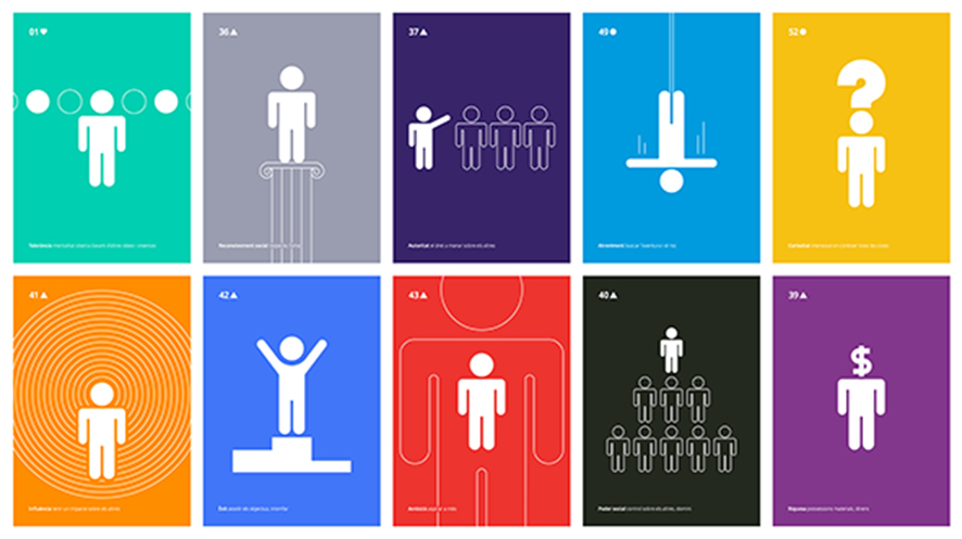 Amb tot, i com era d’esperar, l’aventura gràfica i conceptual de Genís Carreras no finalitza aquí. «El meu darrer projecte —explica— parla dels valors. A tots ens mouen les mateixes coses: l’amistat, l’amor, l’ambició, la creativitat, la diversió… Estudis psicològics ens diuen que existeixen fins a 58 valors diferents que tots compartim però que prioritzem de manera diferent. Aquests valors marquen la nostra manera de ser i d’actuar, tant individualment com col·lectivament». Novament, el resultat és un catàleg gràfic amb reminiscències de joc de cartes que combina a la perfecció l’aparent lleugeresa del seu aspecte (geometria essencial i colors plans) amb la consistència dels seus arguments. És com si tots els treballs realitzats per Carreras romanguessin entrellaçats per aquella «teranyina» invisible però sòlida que Italo Calvino reclamava pel conjunt d’una obra: com en els teixits dels aràcnids, la «lleugeresa» (és el primer valor estètic defensat per l’italià a les Lliçons Americanes de 1984) no només no està renyida amb la «consistència» (protagonista de la darrera lliçó) sinó que és gràcies a ella, a la lleugeresa, que els missatges més profunds es poden propagar en l’espai.