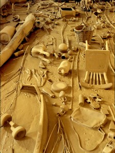 La seva casa-estudi és, en aquest sentit, un arxiu vertical on objectes i obres s’acumulen com el llim fertilitzant dipositat per les riuades periòdiques del Daró que, per cert, pot contemplar a ben poca distància. I és que, tornant als «puntals originals» des d’on es desplega el seu univers creatiu, l’arxiu entès com a compendi de restes d’un hipotètic naufragi (que pot ser cultural, però també tecnològic) esdevé recurrent. Avui per avui, formen part de la memòria col·lectiva exposicions prodigioses i irrepetibles com la que va aconseguir omplir de fang el Museu d’Història de la Ciutat de Girona (novembre de 1982): la radicalitat del seu gest, com dèiem, anticipava tot un seguit de pràctiques que, amb certa perspectiva, hom no pot deixar de veure com a diferents modalitats de manierisme contemporani. La frase que ressona és: «Pere Noguera ja ho ha fet abans».
